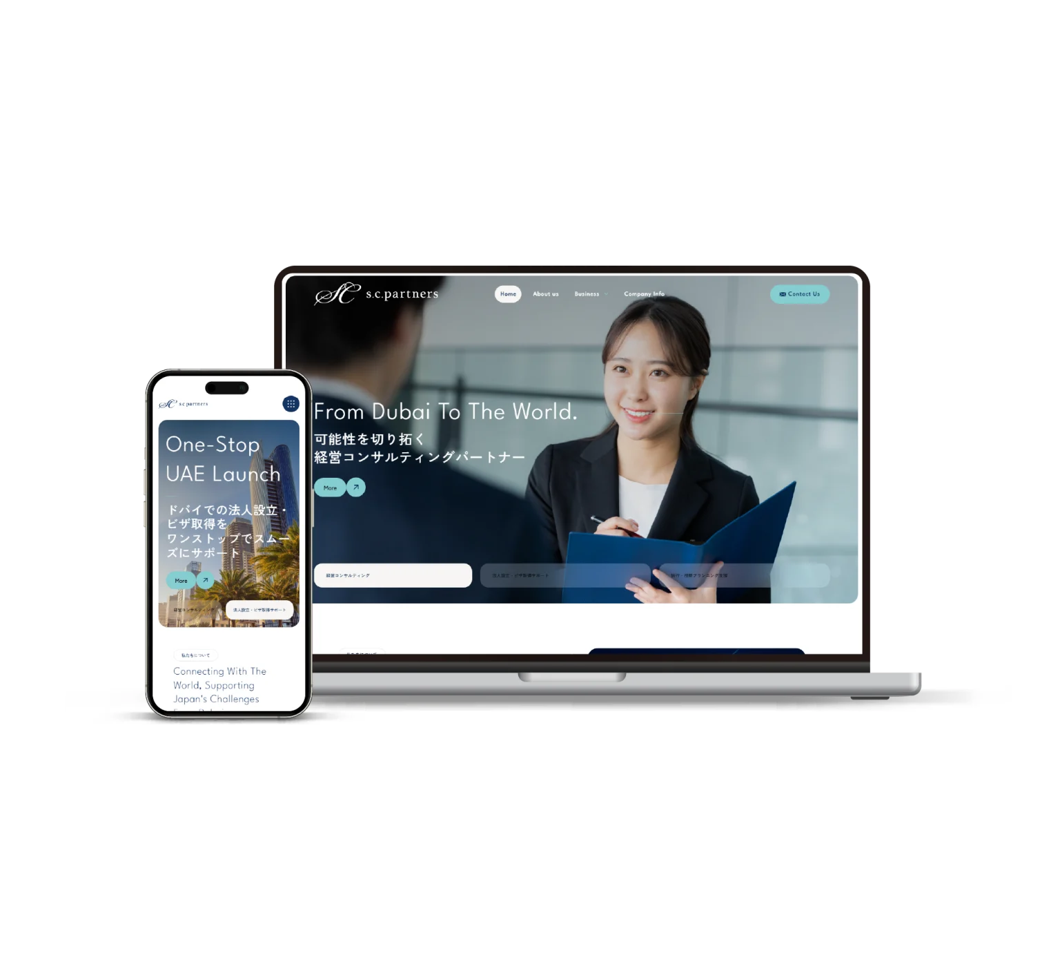 SCパートナーズ様は、ドバイを中心に日本企業のグローバル展開を支援するプロフェッショナル。 「信頼感を第一に」「海外展開に強い印象を」「相談につながる動線設計」などを意識し、初めてのWEBサイトを制作しました。 現地ネットワーク・多言語対応などの強みを、丁寧に整理し“伝わる”構成にしています。 |
